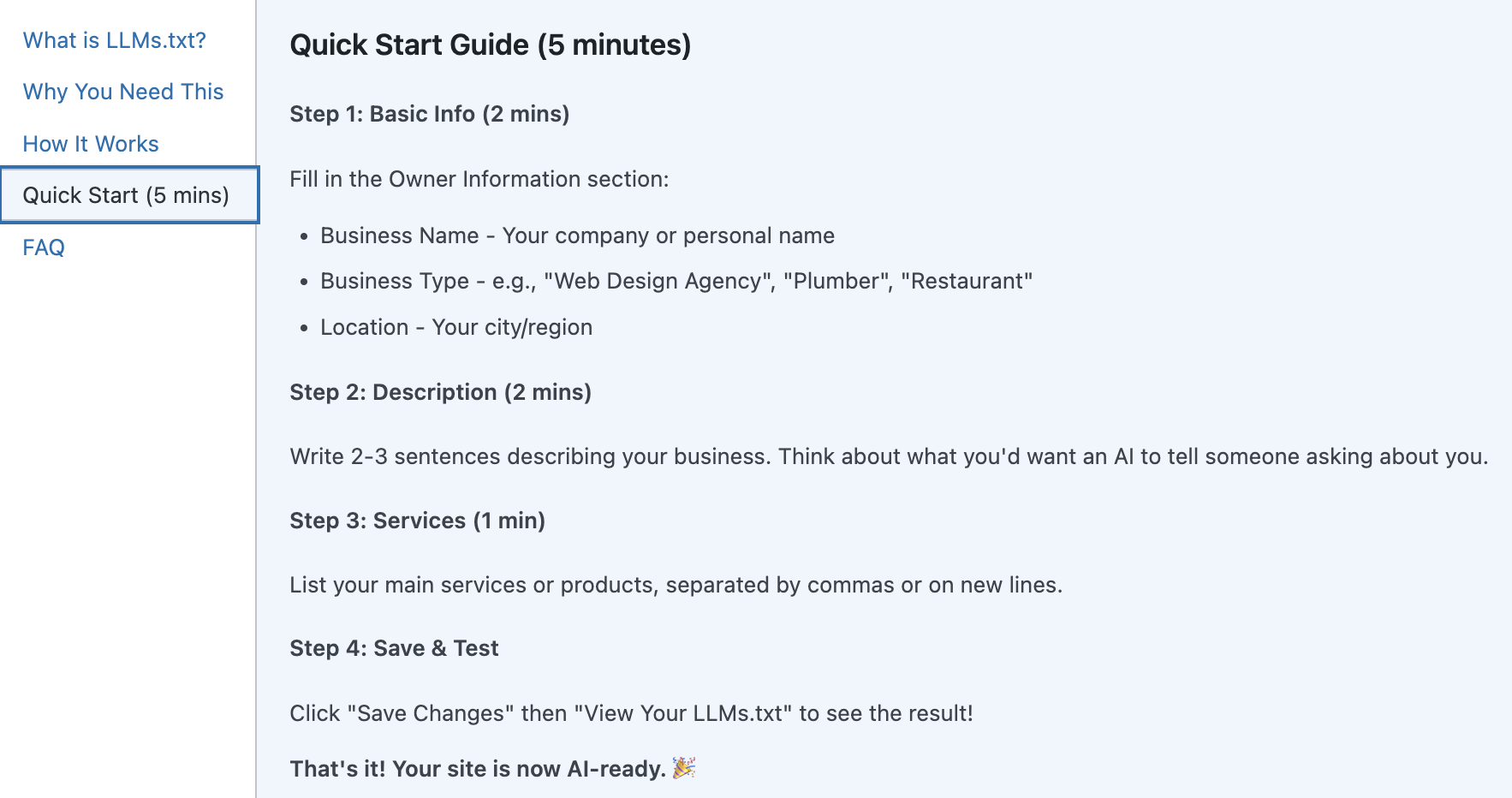 ✅ One-Click Setup – Install, activate, done. Your LLMs.txt is live immediately.