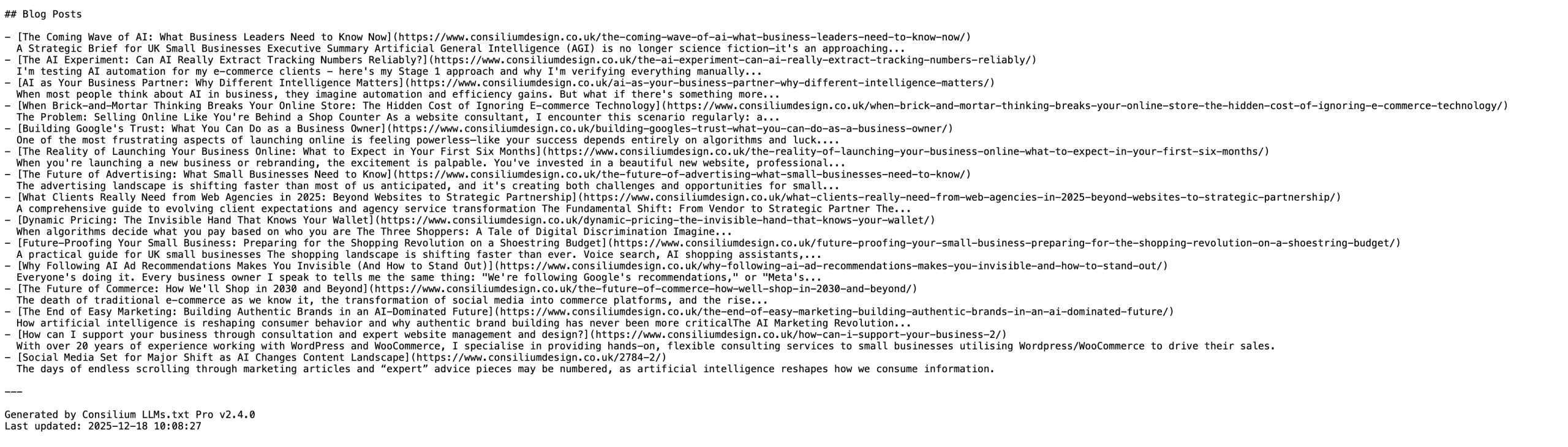 Consilium LLMs.txt Pro is the complete WordPress solution for AI discoverability.